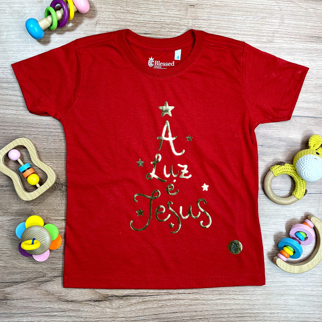 T-Shirt Infantil Vermelha A Luz é Jesus Dourado
