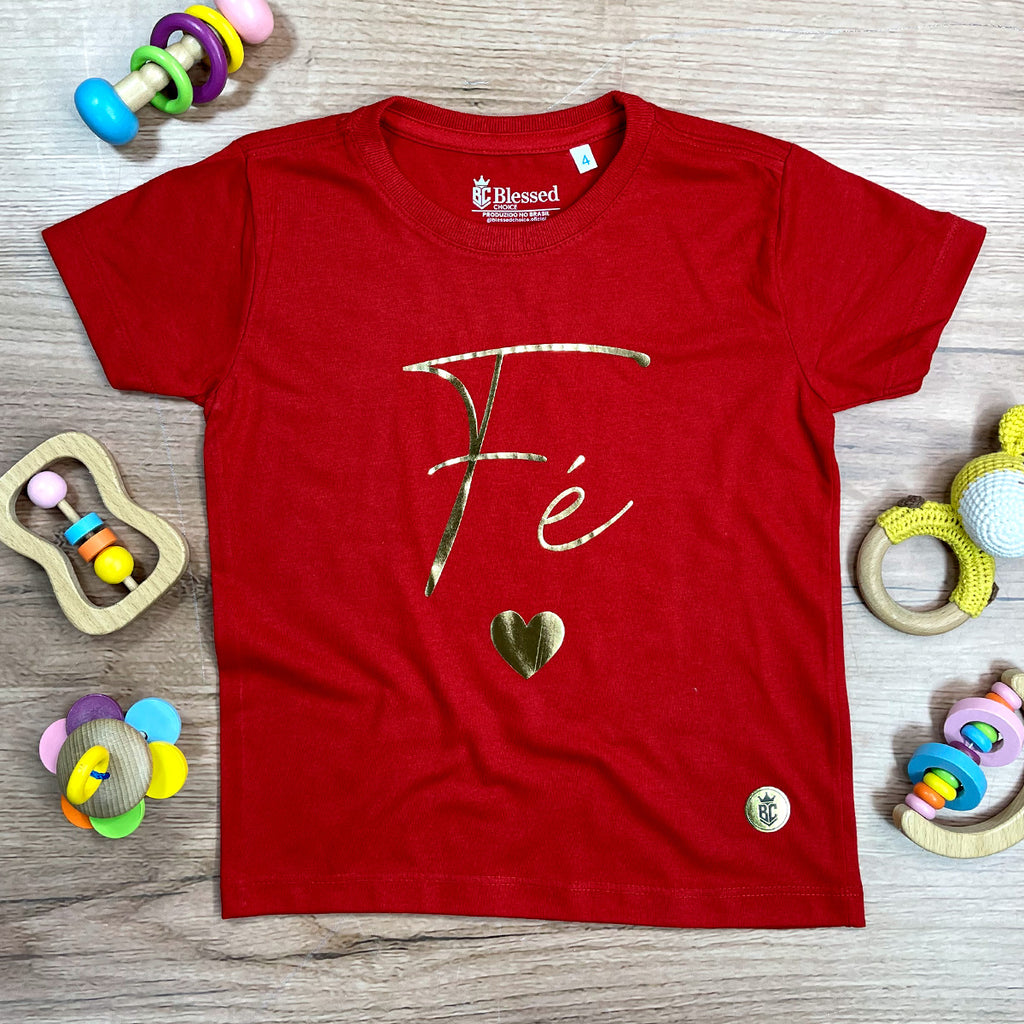 T-Shirt Infantil Vermelha Fé Coração Dourado