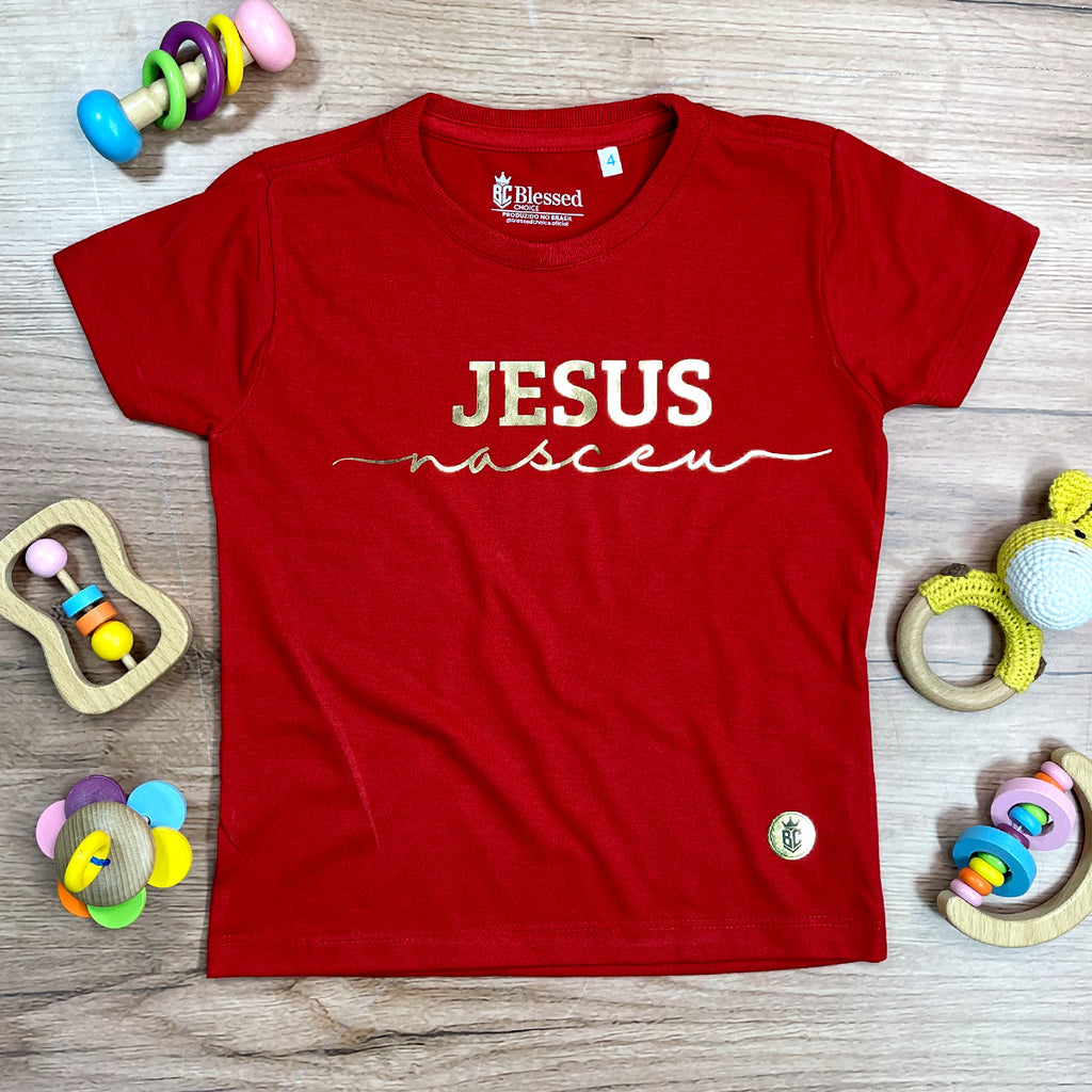 T-Shirt Infantil Vermelha Jesus Nasceu Dourado