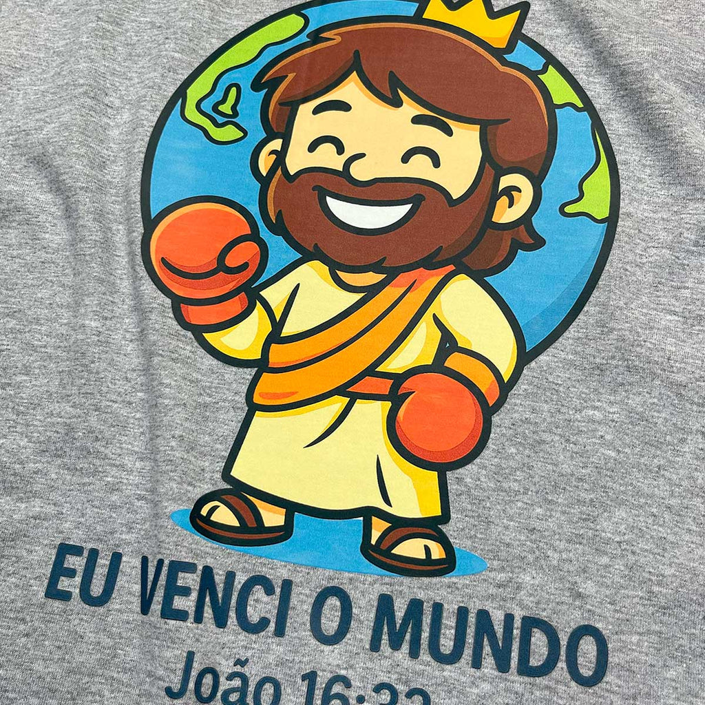 T-Shirt Infantil Cinza Eu Venci o Mundo