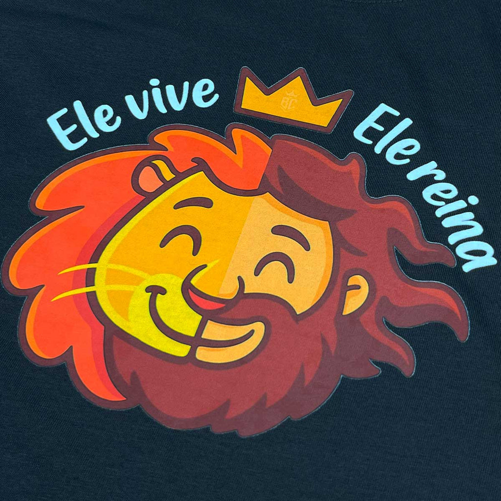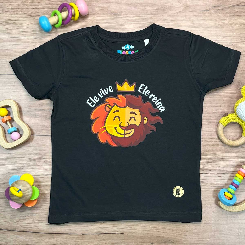 T-Shirt Infantil Preta Leão Jesus Ele Vive Ele Reina