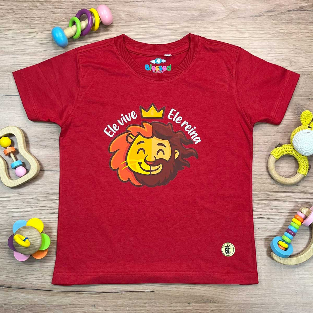 T-Shirt Infantil Vermelha Leão Jesus Ele Vive Ele Reina