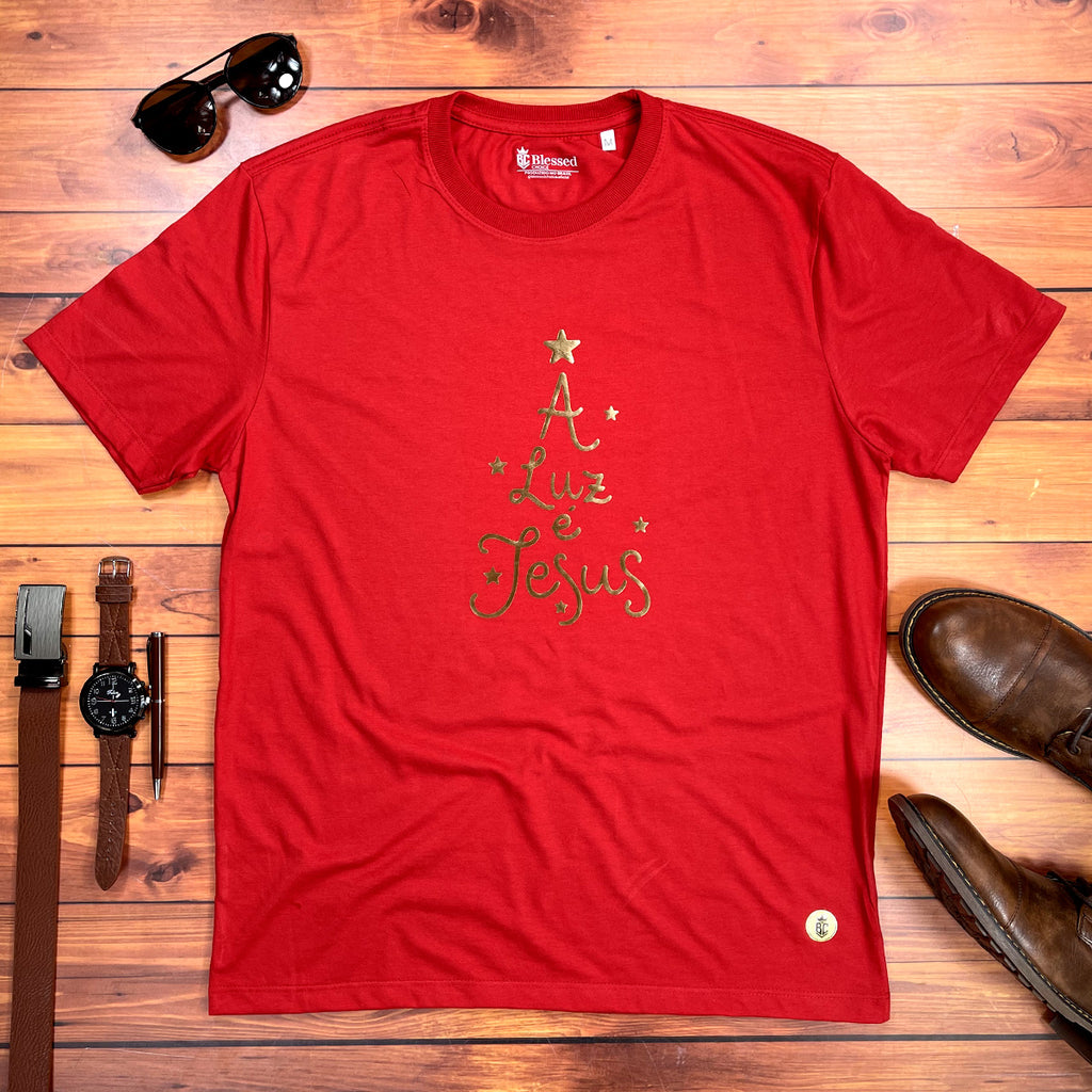 Camiseta Masculina Vermelha A Luz é Jesus Dourado
