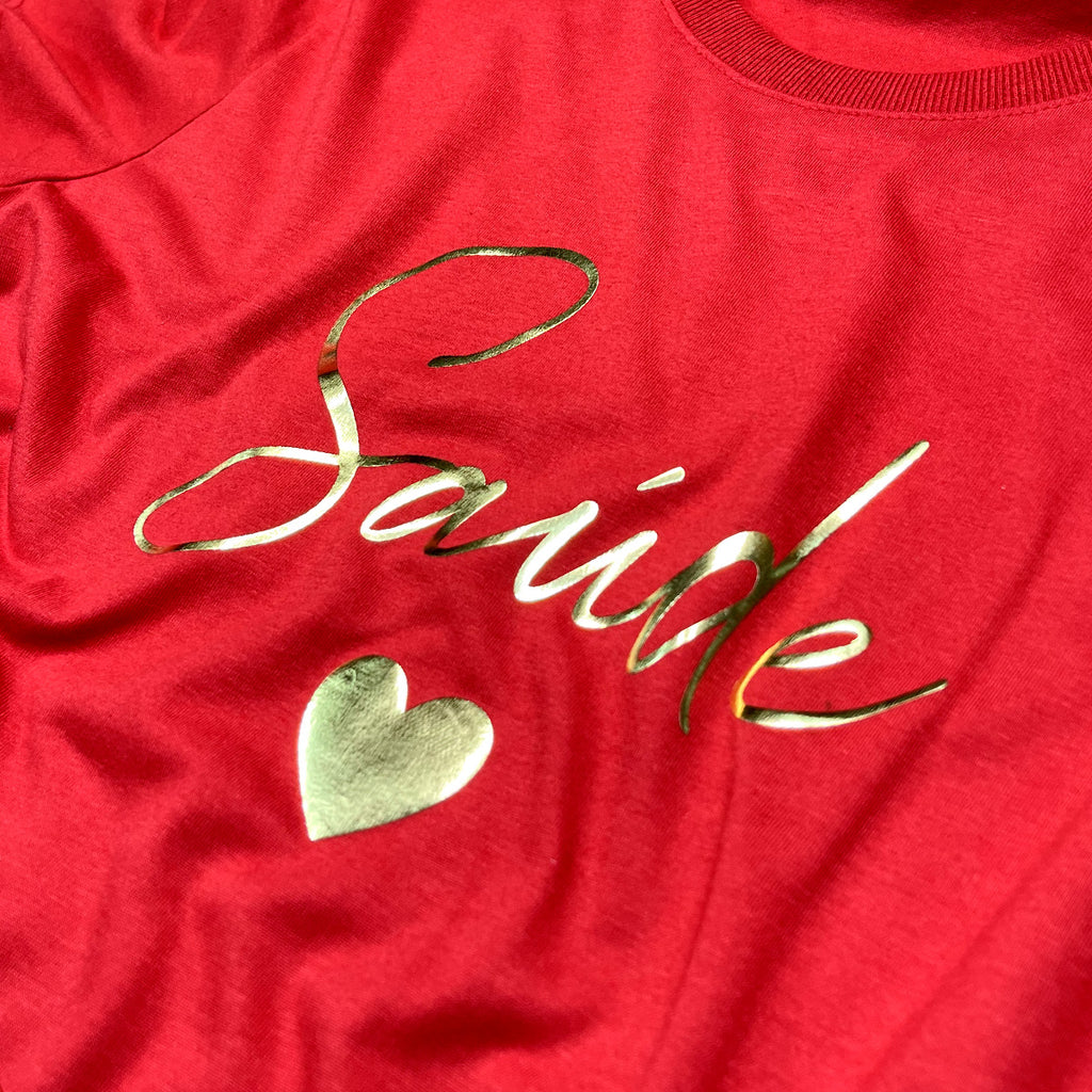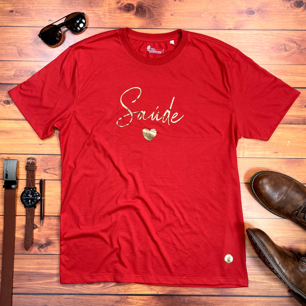 Camiseta Masculina Vermelha Saúde Coração Dourado
